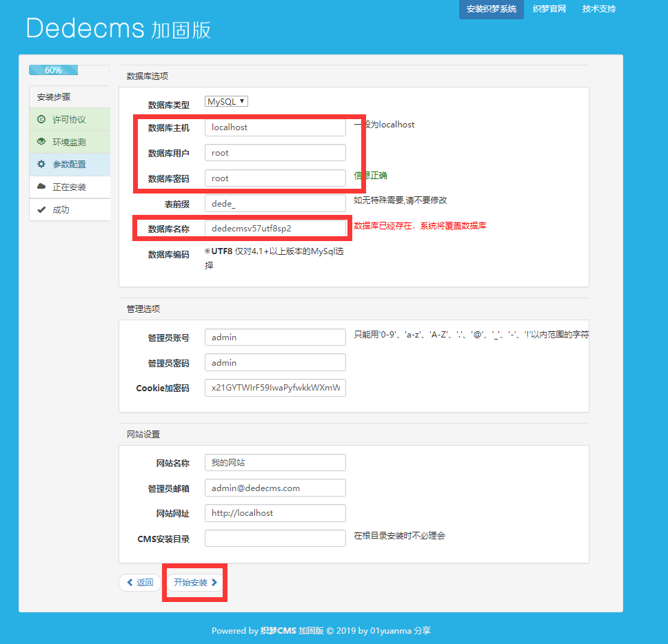 6、输入数据库主机地址、数据库用户、数据库密码、数据库名称,点击【开始安装】(注意:表前缀无特殊需要请不要修改);